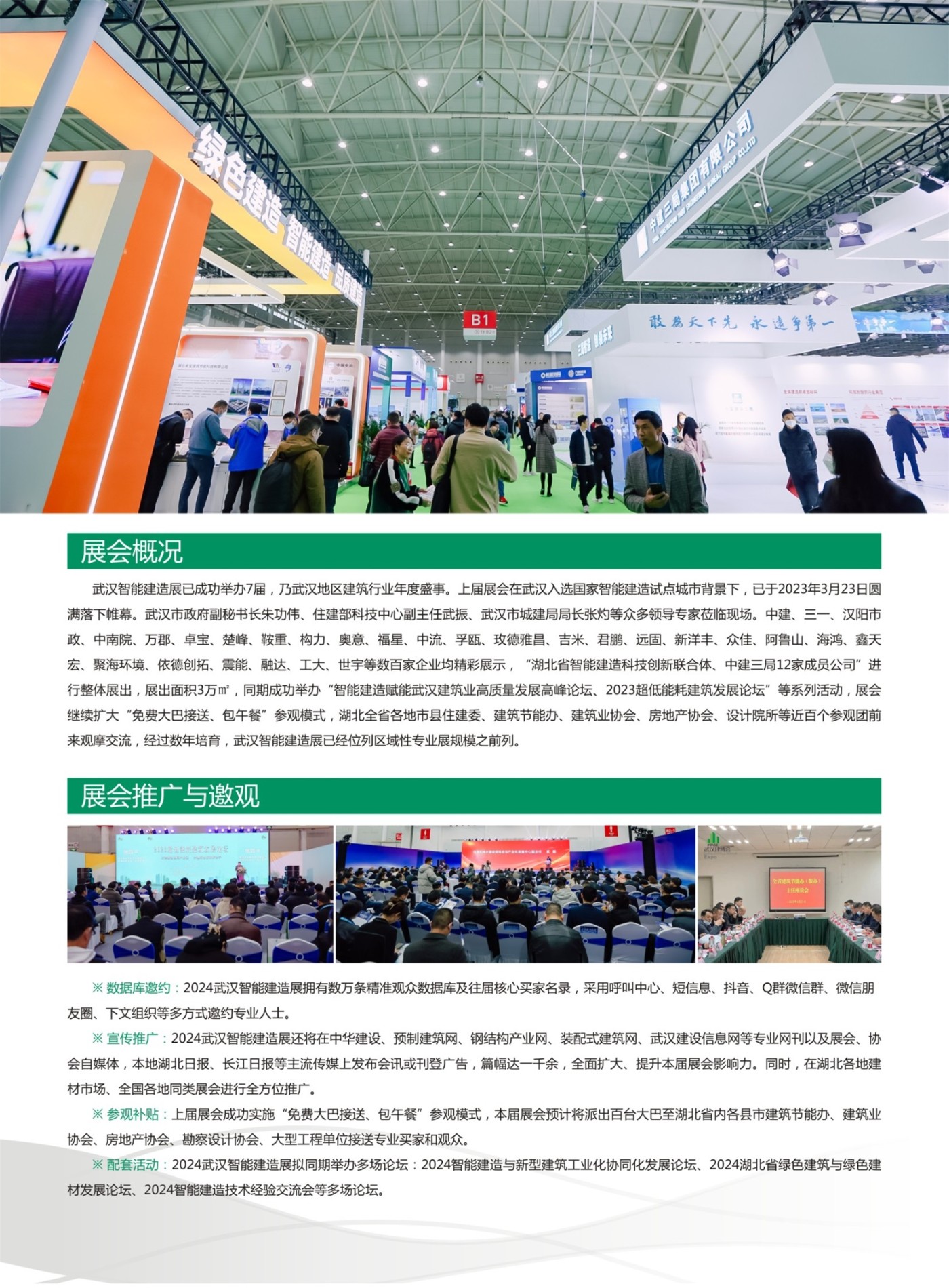 武汉智能建造展已成功举办7届,乃武汉地区建筑行业年度盛事。上届展会在武汉入选国家智能建造试点城市背景下,已于2023年3月23日圆满落下帷幕。武汉市政府副秘书长朱功伟、住建部科技中心副主任武振、武汉市城建局局长张灼等众多领导专家莅临现场。中建、三一、汉阳市政、中南院、万郡、卓宝、楚峰、鞍重、构力、奥意、福星、中流、孚瓯、玫德雅昌、吉米、君鹏、远固、新洋丰、众佳、阿鲁山、海鸿、鑫天宏、聚海环境、依德创拓、震能、融达、工大、世宇等数百家企业均精彩展示,“湖北省智能建造科技创新联合体、中建三局12家成员公司”进行整体展出,展出面积3万㎡,同期成功举办“智能建造赋能武汉建筑业高质量发展高峰论坛、2023超低能耗建筑发展论坛”等系列活动,展会继续扩大“免费大巴接送、包午餐”参观模式,湖北全省各地市县住建委、建筑节能办、建筑业协会、房地产协会、设计院所等近百个参观团前来观摩交流,经过数年培育,武汉智能建造展已经位列区域性专业展规模之前列。