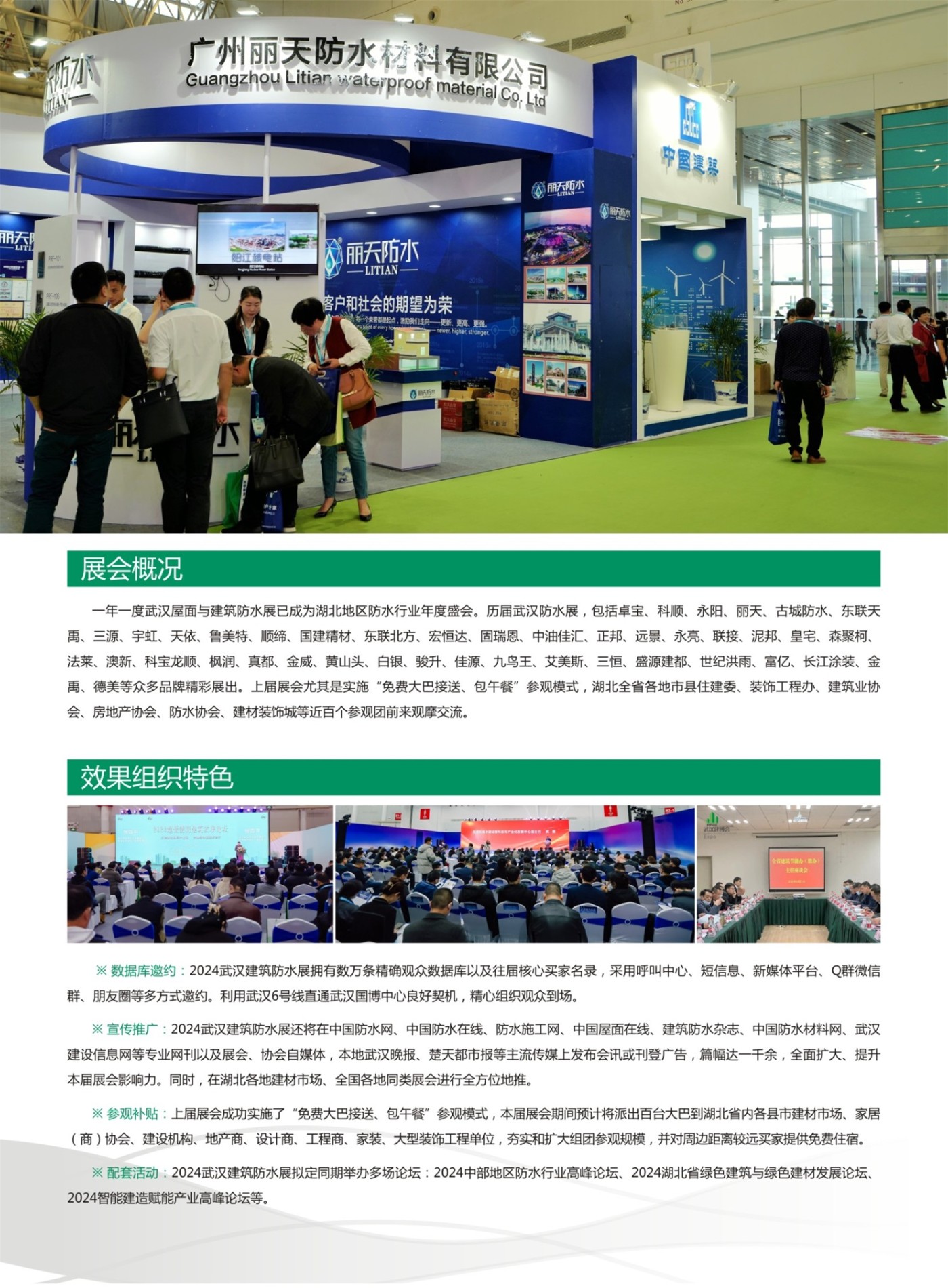 配套活动。2024武汉建筑防水展拟定同期举办多场论坛:2024中部地区防水行业高峰论坛、2024湖北省绿色建筑与绿色建材发展论坛、2024智能建造赋能产业高峰论坛等。