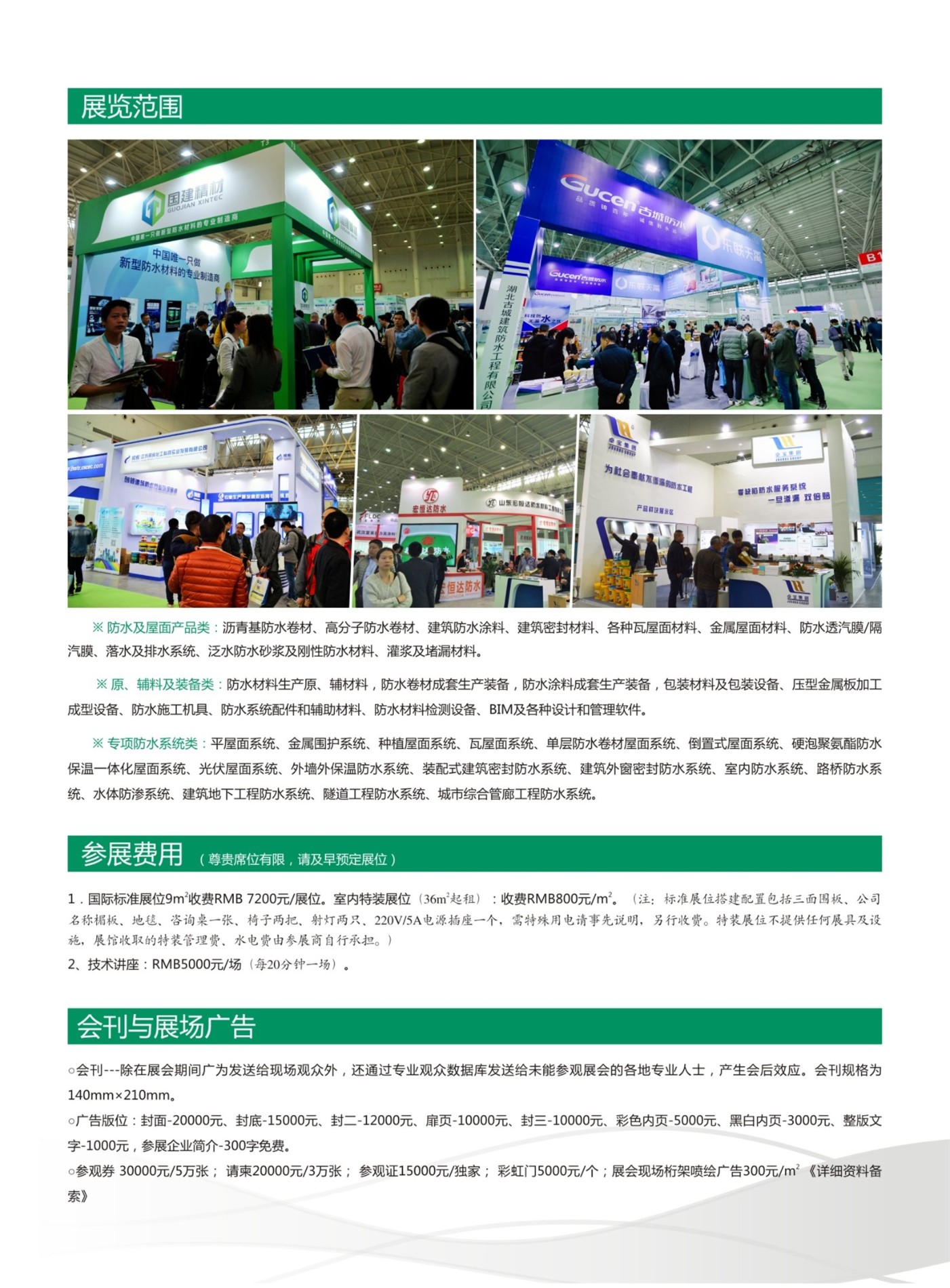 原、辅料及装备类:防水材料生产原、辅材料,防水卷材成套生产装备,防水涂料成套生产装备,包装材料及包装设备、压型金属板加工成型设备、防水施工机具、防水系统配件和辅助材料、防水材料检测设备、BIM及各种设计和管理软件。