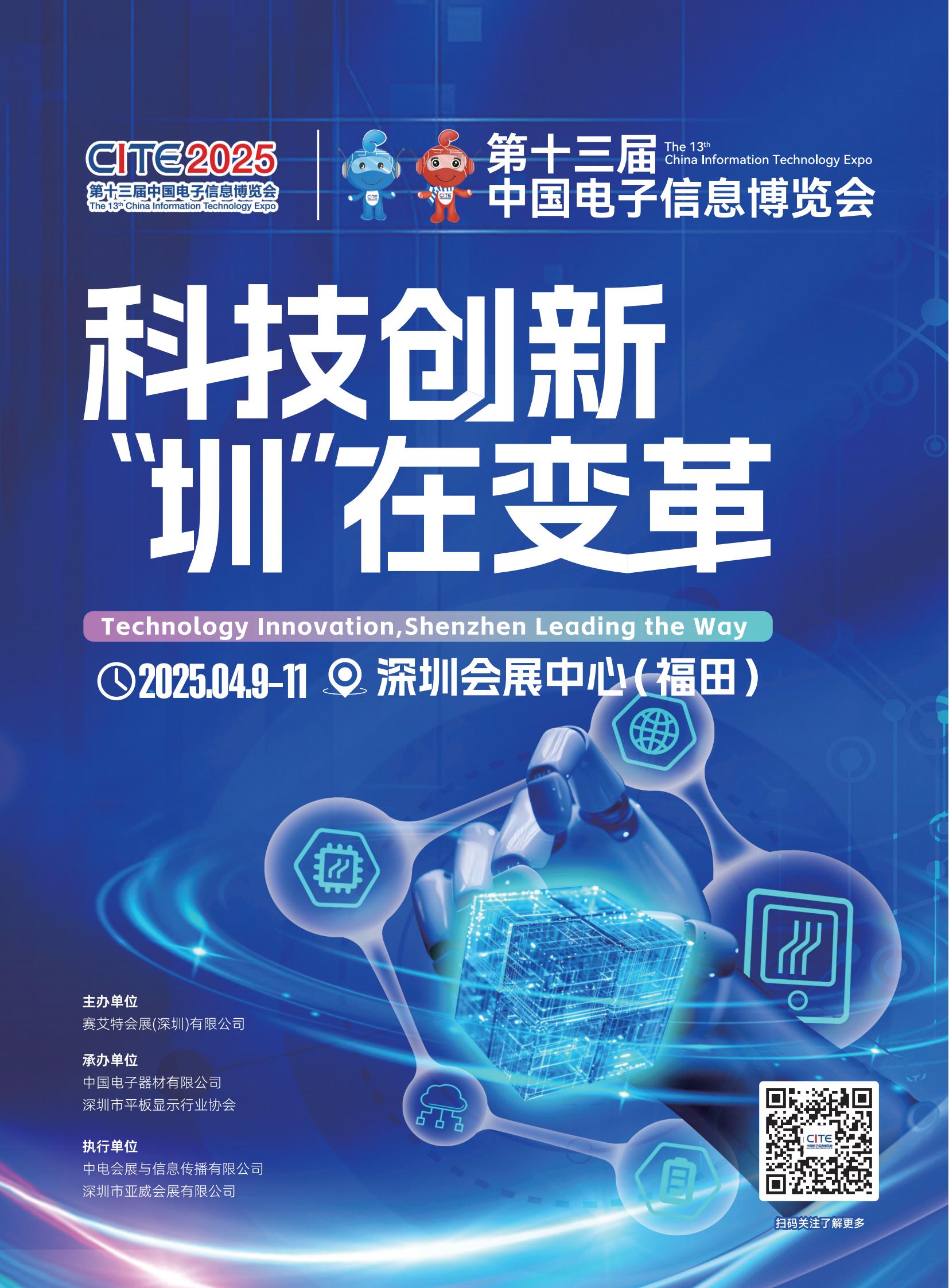 亚洲极具规模和影响力的综合性电子信息博览会由工业和信息化部与深圳市人民政府联手打造的国家级电子信息全产业链展示平台中国电子信息博览会(CITE)将2025年4月9日-11日在深圳会展中心举行